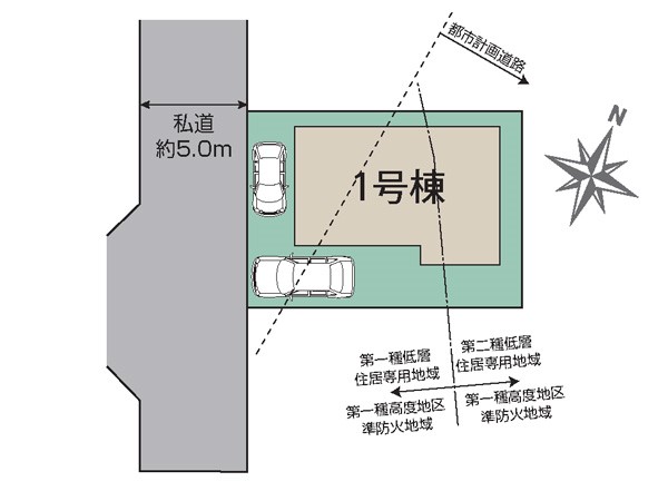 | 接道状況 | 接道: 西 私道 道路幅: 5m | 用途地域 |